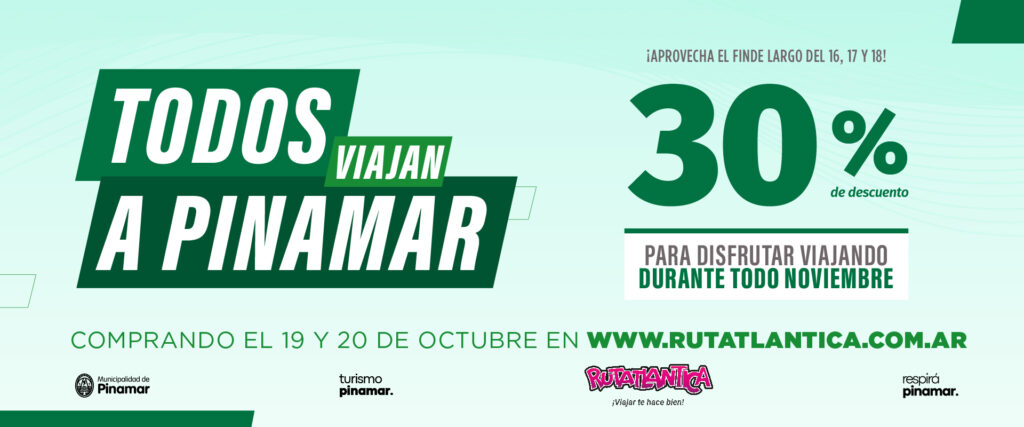 Comprando pasajes a Pinamar por Rutatlantica los días 19 y 20 de octubre, se puede acceder a un 30% de descuento en pasajes para todo noviembre, ¡incluyendo el fin de semana largo! Válido solo para compras por la web. Ingresar ACÁ.
