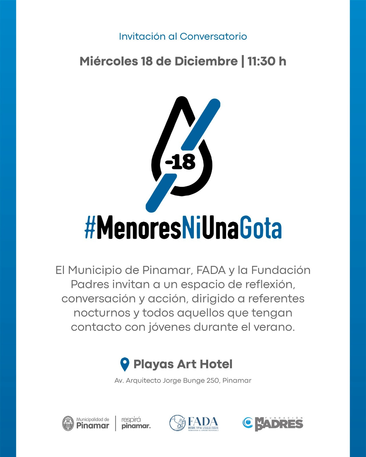 El miércoles 18 de diciembre, a las 11.30h el Municipio de Pinamar, FADA y la Fundación Padres invitan a un espacio de reflexión, conversación y acción, dirigido a referentes nocturnos y todos aquellos que tengan contacto con jóvenes durante el verano. – Playas Art Hotel – Av. Bunge 250 Pinamar